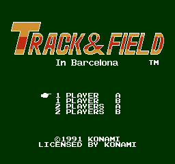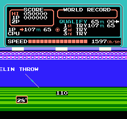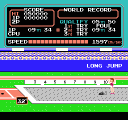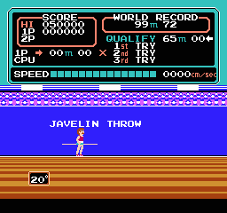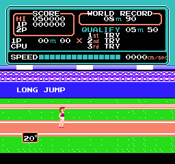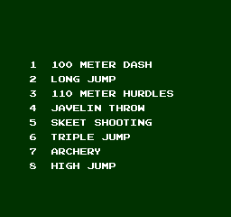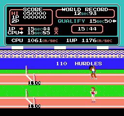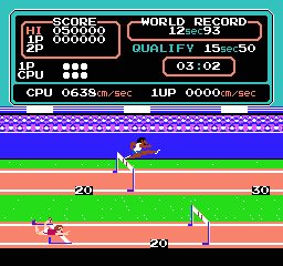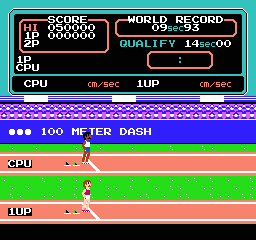 100 meter dash, This involved a quick finger on the A button and press it until you cant feel your hands any more. But if your lazy and just get over it quickly then a auto fire controller was a must. But this was cheating. The CPU player is surprisingly good sometimes, not that you have to beat him, but you have to beat the qualifying time and this time got shorter every round your would finish, just like with all the other events in the game.