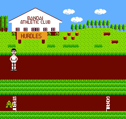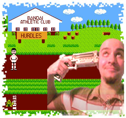 So the first event of the 5 we get to try is the Hurdles. I HAVE TO POINT OUT at this juncture that the average loading time at the beginning of each level is ... no kidding at least 50 seconds! Patience is not strong in my mind as an adult, can you imagine how a 10 year old (who probably had ADD) handled the wait!? No, you cannot. As soon as I begin, I realise the next 4 events are going to piss me off more and more as I progress through each. So I'm running along (All the while wondering if the movie "The Ringer" was based on my 8bit alter ego), as I approach the first hurdle I attempt to jump... attempt failed.