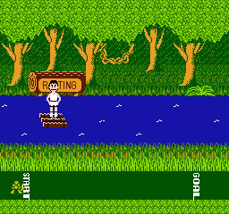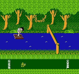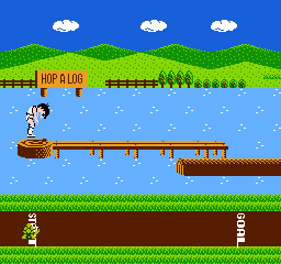 I obviously have the brain capacity of a lemming on crack because I took one step and fell in the water! The funny thing about this level is that if you make it a few hops along the log then fall off, your character swims back a few hops, only leading me to the tedious inevitability of suicide.