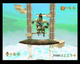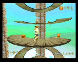 Anyway, onto the game. The game seems very misleading from the box to the game. On the box the game shows this pretty fun adventure game that doesn't look like its stuck with just moving up a tower. But in reality the game is nothing more then a jump from platform to platform while being in some sort of half asred tower (which has no scaffolding I might add). What is sad is the fact that this is ALL YOU DO in the whole game. It's kinda like an ant stuck at the bottom of a Pringle's packet trying to to out to the top.