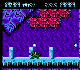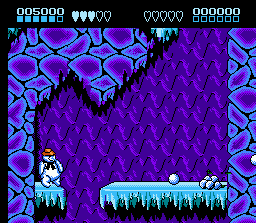 This game is seriously evil. I can't describe the amount of pain I have endured doing this level for the first time. It's interesting to see the amount of "ideas" that made it into other Rare games; like the large spike things can be seen in Donkey Kong Country 3 in the water levels. What gets me in this level is the way that enemies and objects can appear from where you have already been and kill you unsuspectingly. Or you can find objects like snow balls coming at you, and you have no idea were it came from as seen below.